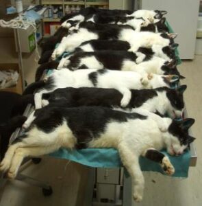 Das Bild mit den 8 kastrierten Katzen und Katern ist ein Beispiel für eine “Massenkastration”, wie sie im Tierheim leider/zum Glück häufig vorkommt.