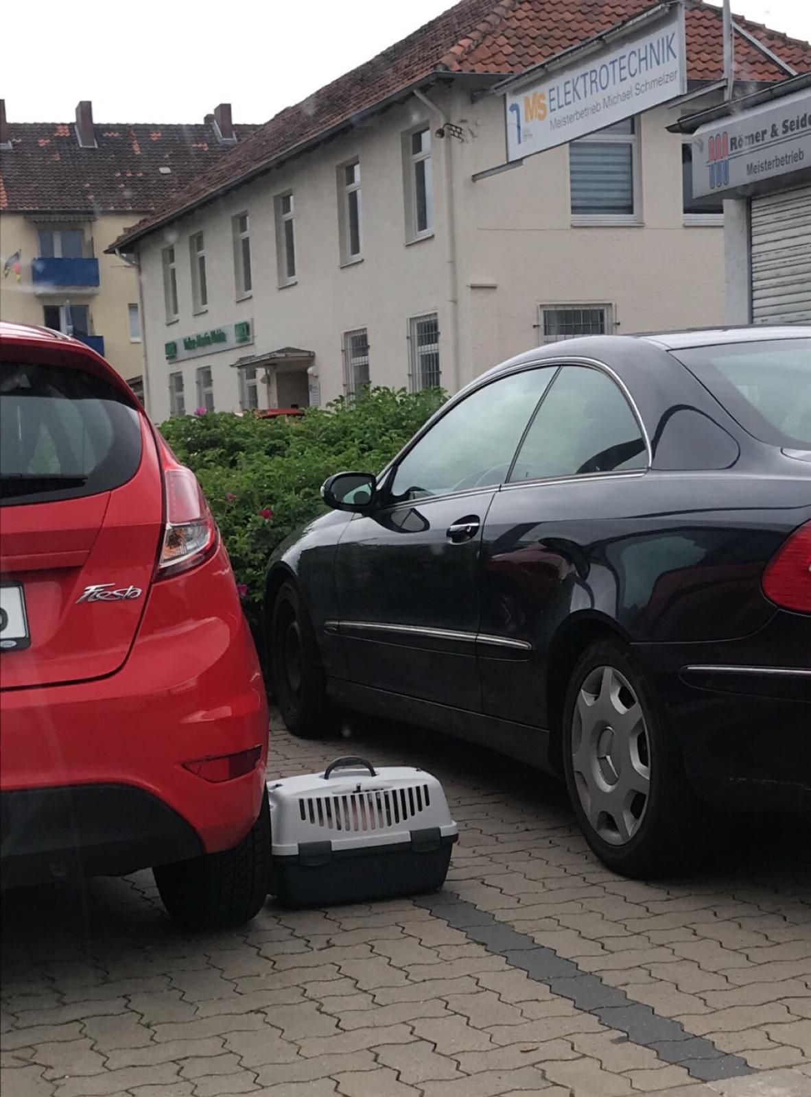 Ausgesetzter Kater in Box auf Edekaparkplatz am Vatertag