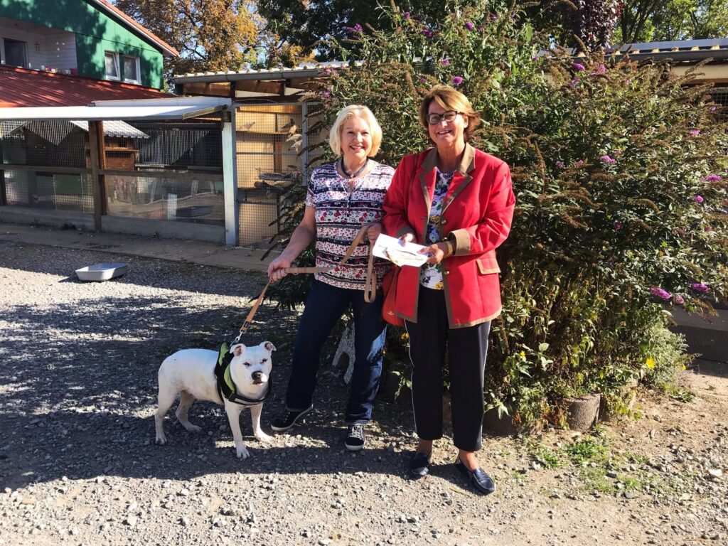 Bild von Benita Heldmann: Übergabe der Geburtstagsspende von Frau Trudel Rappe an Frau Sabine Oelschläger unter den wachsamen Augen des Tierheimhundes Denny