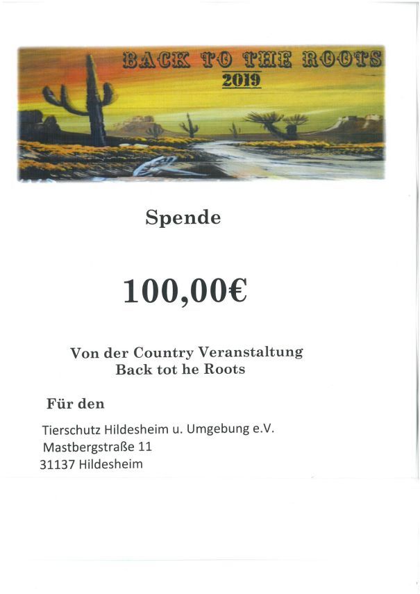 Diese Spende in Höhe von 100 euro konnte durch die Country Veranstaltung “Back to the Roots 2019” für das Tierheim erwirtschaftet werden. Vielen Dank an Herrn Thomas Fricke.
