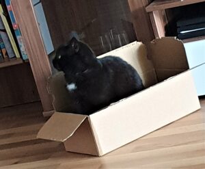 Was uns am meisten beeindruckt, ist, dass sie langsam sogar in Kartons geht. Zuerst hat sie die angebotenen Kartons nur zerstört. Aber manchmal setzt sie sich jetzt hinein.