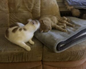 Wir wünschen noch ein Frohes neues Jahr und wollten berichten wie es so läuft. James hat sich die ungewöhnlichsten Schlafplätze ausgesucht. So lange er sich wohl fühlt und nicht vom Schrank fällt ist das ok. Mit Felix versteht er sich sehr gut. Die Beiden spielen viel und liegen zusammen im Bett. Mit Tiger versteht er sich überhaupt nicht. Wir müssen die Beiden immer trennen. James jagt ihn es wird gefaucht und geknurrt. Bin mit meinem Latein am Ende. Mir graut es vor dem Sommer wenn die Türen offen stehen. Mit Fressen ist es bei James immer noch eine Katastrophe. Koche wieder für Ihn?