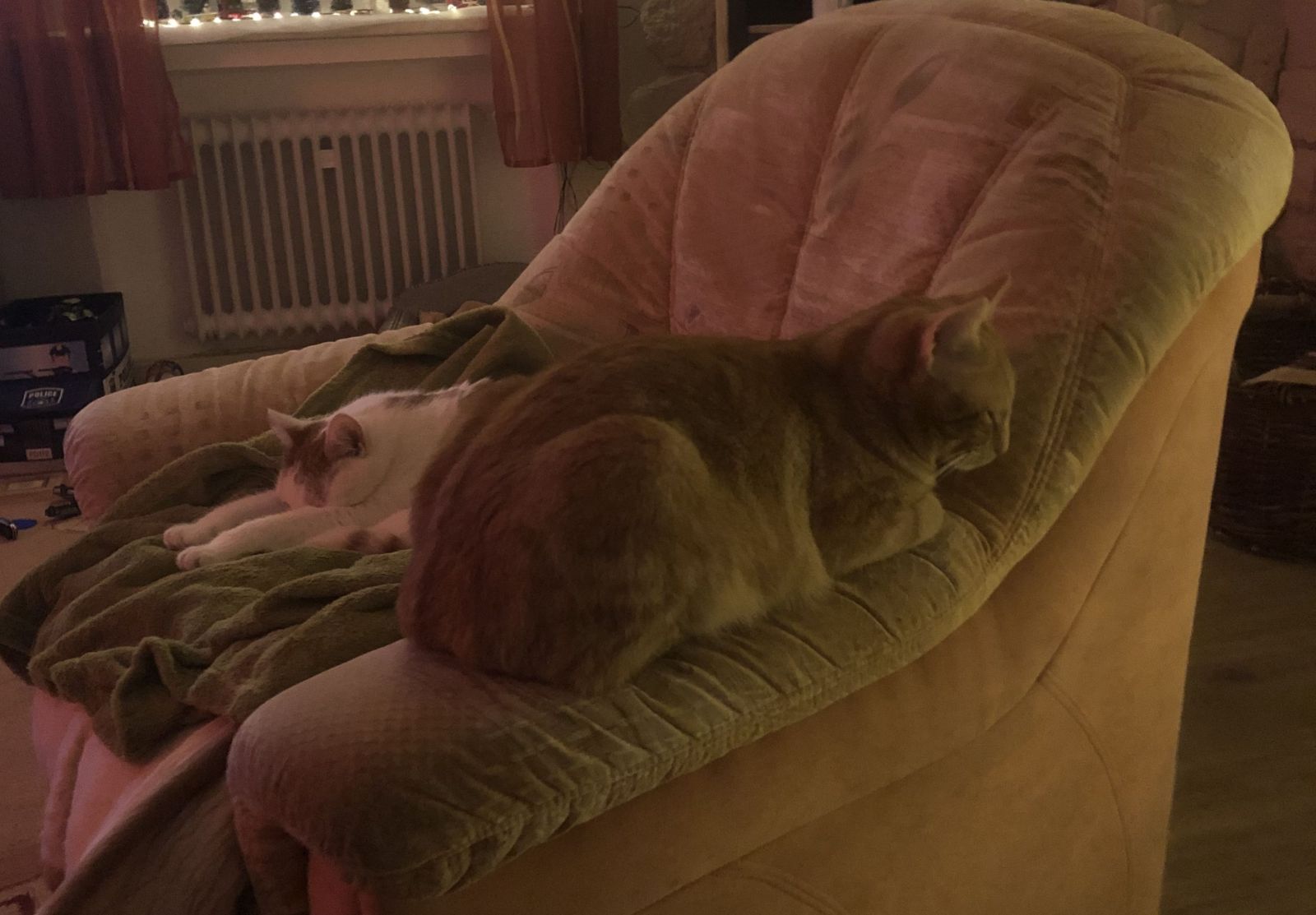 Wir wünschen noch ein Frohes neues Jahr und wollten berichten wie es so läuft. James hat sich die ungewöhnlichsten Schlafplätze ausgesucht. So lange er sich wohl fühlt und nicht vom Schrank fällt ist das ok. Mit Felix versteht er sich sehr gut. Die Beiden spielen viel und liegen zusammen im Bett. Mit Tiger versteht er sich überhaupt nicht. Wir müssen die Beiden immer trennen. James jagt ihn es wird gefaucht und geknurrt. Bin mit meinem Latein am Ende. Mir graut es vor dem Sommer wenn die Türen offen stehen. Mit Fressen ist es bei James immer noch eine Katastrophe. Koche wieder für Ihn?