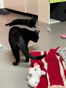 Jetzt sind wir schon in der 4. Woche, die Zeit rennt. Fran wird immer zutraulicher und der Katzenraum ist mittlerweile ein großer Abenteuer-Spielplatz für die beiden. Es wird alles auseinander genommen :-))) Luna ist nach wie vor sehr ängstlich, aber es wird jeden Tag ein Millimeter besser. Wir hoffen, sie legt ihre scheu und Ängstlichkeit irgendwann ab. Ab und zu kommt der Entdeckergeist und die Neugier sichtbar durch und dann würde due gern loslegen, aber dann – kurz vor dem Ziel-, überwiegt die Angst vor der eigenen Courage. Insgesamt läuft es aber gut. Anbei noch ein paar schöne Impressionen.
