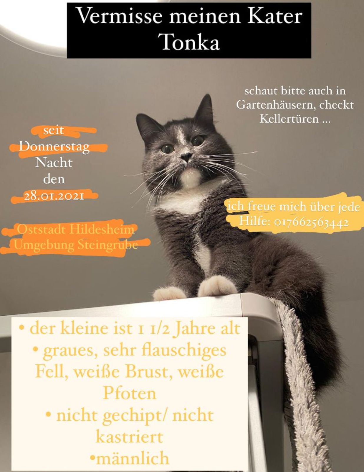 Vermisst – Kater Tonka aus der Hildesheimer Oststadt Nähe Steingrube 03.02.2021 03.02.2021 vermisste Tiere Tel: 0176/62563442