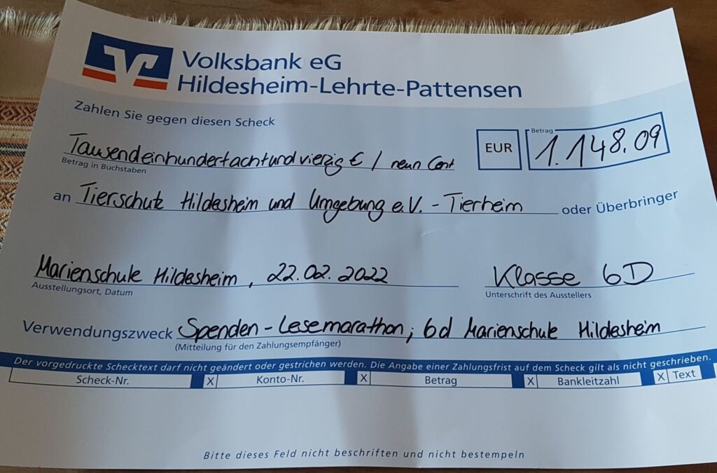 Vielen Dank für die Spende und das tolle Engagement im Lesewettbewerb 23.02.2022 23.02.2022 Allgemeines Vielen Dank an die Klasse 6d der Marienschule in Hildesheim. Die Schülerinnen und Schüler erlasen sich über 2000 Euro und spendeten uns 1148,09 Euro. Ein riesiger Betrag und ein vorbildliches Engagement für Tiere. Vielen Dank im Namen aller Tiere.