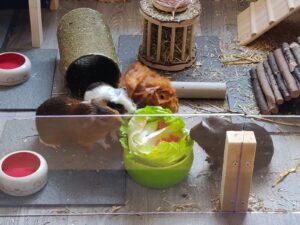 Alle vier fühlen sich sehr wohl in ihrem großen Stall und toben gern darin herum. Frisches Futter wird natürlich 24/7 verlangt, die drei täglichen Mahlzeiten + Heu reichen ja bei weitem nicht aus! Schön ist, dass sich drei von den vieren bereits aus der Hand füttern lassen, besonders gern mit Zucchini, Fenchel und Paprika. Wenn es so gut weiter läuft, fange ich demnächst an, sie ans Streicheln, Einfangen und Hochheben zu gewöhnen. Ich bin super glücklich mit meiner Bande und hoffe, sie sind im Gegenzug auch zufrieden mit mir.:)