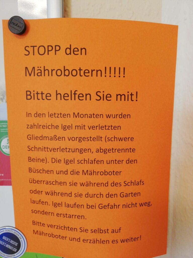Gerade jetzt ab August und im Herbst sind viele Jung-Igel mit dem Einsetzen der Abenddämmerung unterwegs auf Nahrungssuche. Beim Zusammentreffen mit einem Mähroboter rollen sie sich zwar ein, aber die Sensoren des Geräts erkennen die feinen Stacheln nicht als Widerstand und rollen über das Tier hinweg. Die Folgen sind schlimme Schnittwunden und letztlich ein qualvoller Tod.