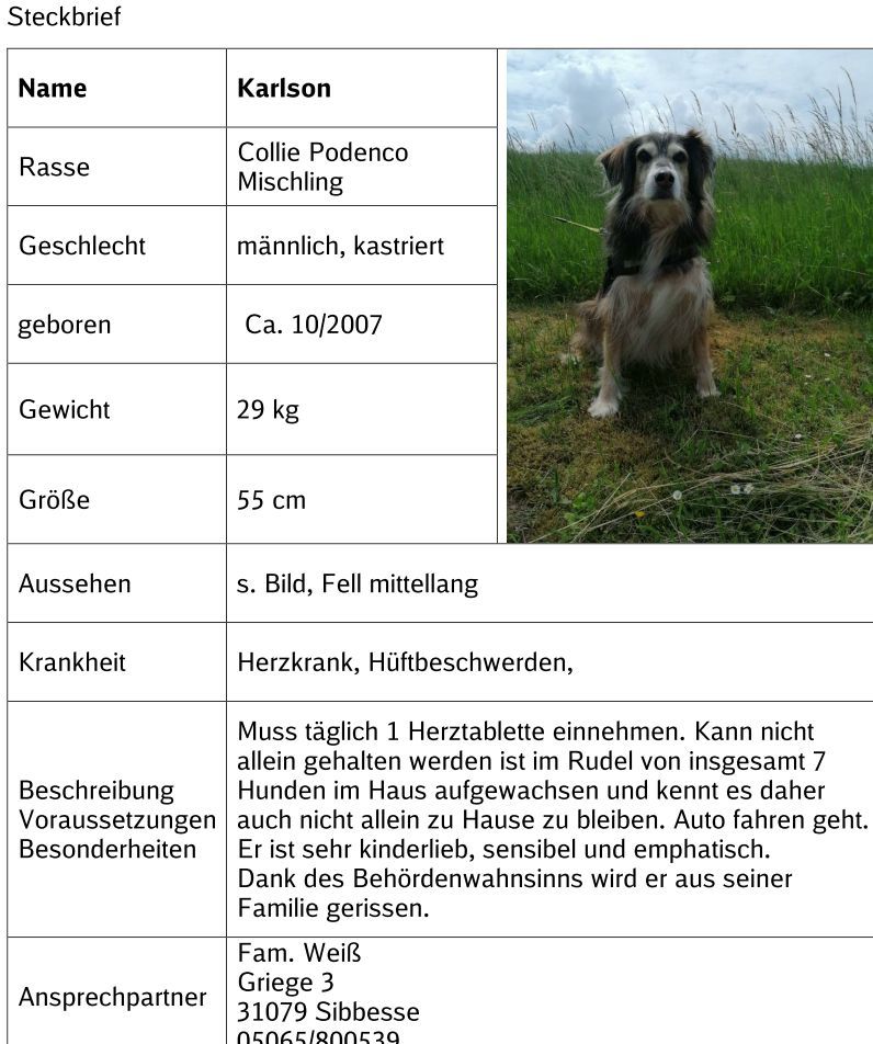 Karlson sucht ein neues Zuhause. Bitte beachten Sie den Steckbrief. (Wird größer angezeigt, wenn man draufklickt)